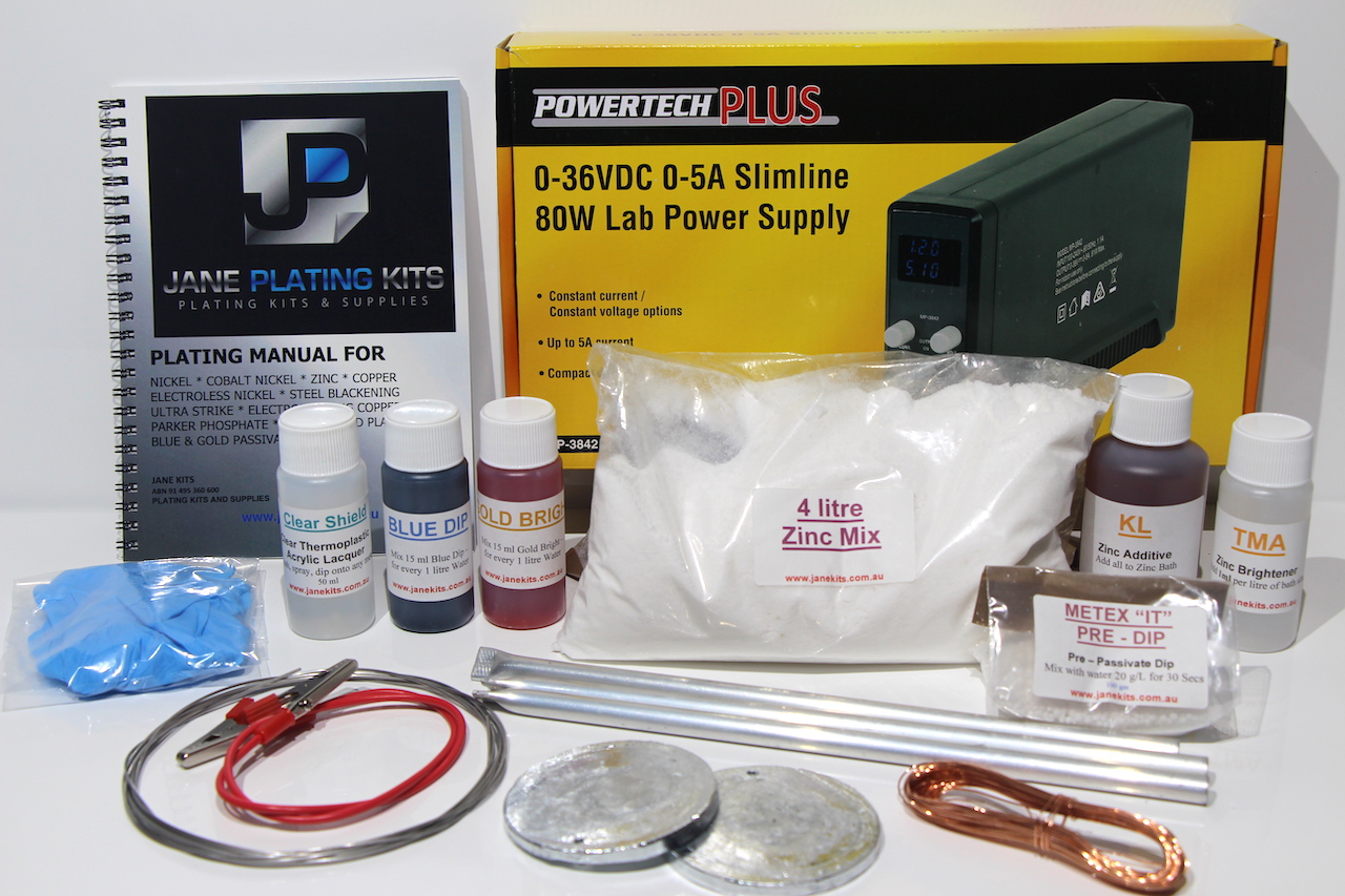 Complete 4 Litre Zinc Kit which includes all items necessary to successfully conduct your own plating. This kit contains plating chemicals which are mixed with water to create a 4 litre plating bath. It also includes a laboratory type Power Supply. See the full list of Kit contents and Zinc Plating information in the “ELECTROPLATING KITS” category on the home page.